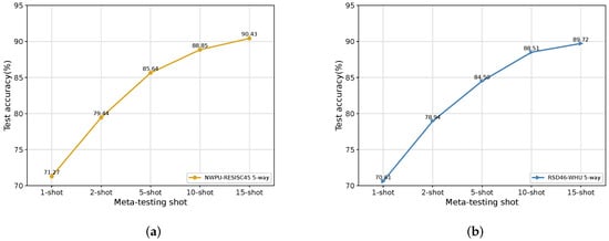 Ablation studies to show the performances of the meta-testing shot. (a) shows experimental results on NWPU-RESISC45, and (b) shows experimental results on RSD46-WHU.