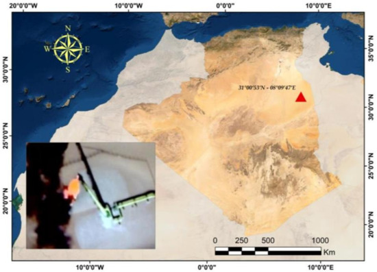 Furthermore, through the SONATRACH company, Algeria has several oil and gas flaring fields; among them, the five most significant are Alrar (Illizi), Hassi R’Mel, Tin Fouye Tabankort (TFT Illizi), Tiguentourine (In Amenas), and the considered Berkine basin in Hassi Messaoud [17]. This basin, with an area of 102,395 km2, is one of the oldest and largest oil fields in Algeria and the African continent [17]. It is located in the northeastern part of the Saharan Platform. It is limited to the West by the structural axes of Rhourde Nouss and to the South by the old mole of Ahara-El Ouar, of East–West orientation [17].