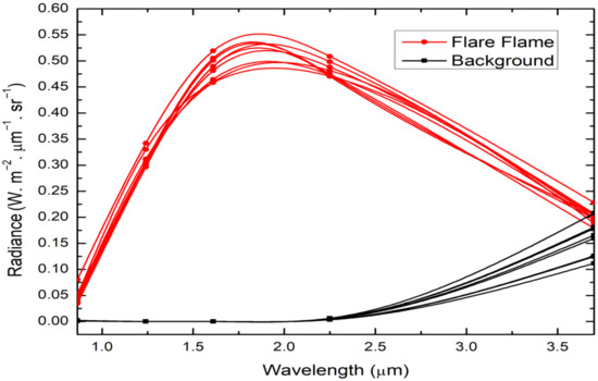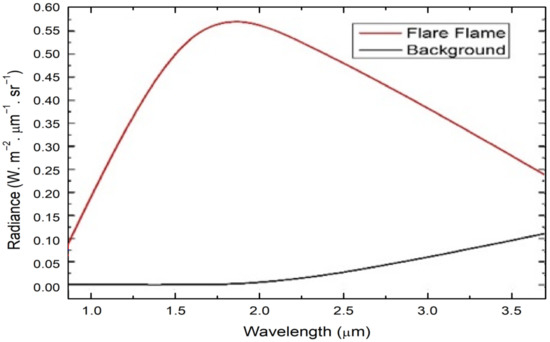 Two sets of spectra (flare flame and background) from 0.865 to 3.700 μm, with spectral variability (Figure 4), are used to create 20 × 20-pixel synthetic data. The used background spectra are directly extracted from real VIIRS NTL data [18], while the flare flame spectra are obtained using Planck’s law Equation (1) by setting one of the two parameters, temperature or emissivity, for each created flare flame spectrum and varying the other.