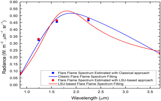 Furthermore, from Figure 7, it can be seen that a spectrum resulting from the considered synthetic VIIRS NTL data for a pixel containing a flare flame, with the higher value in the spectral band M10, has lower amplitudes than the pure flare flame spectrum extracted by the considered unmixing-based approach in the same pixel. Indeed, given that the considered NTL data are characterized by a very low spatial resolution, the observed pixel spectrum is therefore a mixture of background and flare flame objects. Consequently, and since the mixture is assumed to be linear in the designed unmixing-based technique, the observed flare flame pixel spectrum (which also contains a larger area of background than the area occupied by the flare flame), used as in the classical approach, has lower amplitudes. As a result, when considering the proposed unmixing-based approach (with the pure flare flame spectrum), the Planck curve identified after fitting will have relatively higher amplitudes than those identified with the classical approach (with the mixed pixel spectrum).