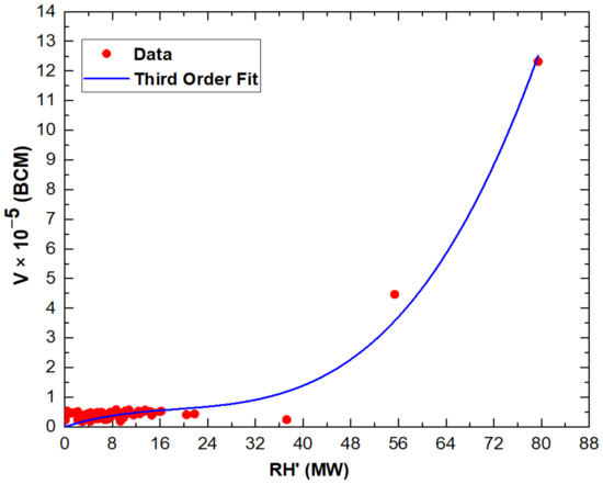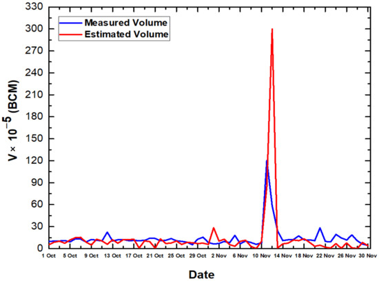 On the other hand, Figure 10 and Table 5 show a good and improved determination coefficient of the established by means of “hourly” in situ measurements of the two months of October and November 2021, intercepting zero “third-order” polynomial regression model, with satisfactory and improved RMSE results. In particular, when considering the 156 dates of 2020, the RMSE value changes from 5.6935 × 10−5 BCM (Table 3), with the use of the intercepting zero “first-order” polynomial regression model and with provided “daily” in situ measurements of the two months of April and May 2020, to 5.2423 × 10−5 BCM (Table 5) with the use of the intercepting zero “third-order” polynomial regression model and with provided “hourly” in situ measurements of the two months of October and November 2021.
