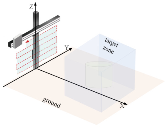 The measurement configuration is shown in Figure 1. X is the range direction, Y is the azimuth direction, and Z is the elevation direction. The echo data is obtained by scanning the target region with a planar array. The virtual array is formed by the movement of the antenna in the azimuth direction and elevation direction. High range resolution is achieved by transmitting broadband signals. The array resolution is achieved by synthetic aperture in azimuth and elevation. Due to the SAR image obtained by traditional MF having a high sidelobe and being easily disturbed by noise, the sparse reconstruction regularization method is introduced to obtain high-quality SAR images.