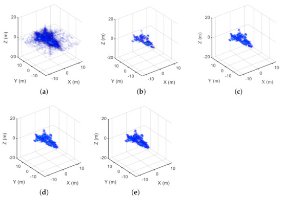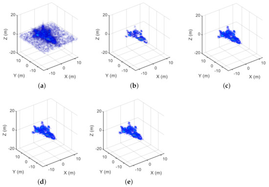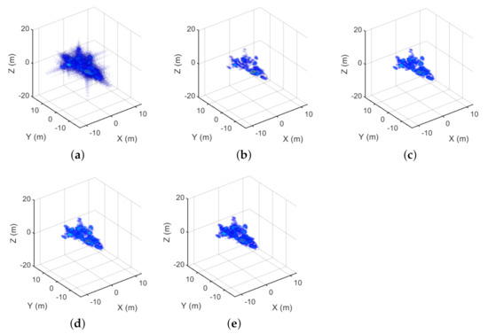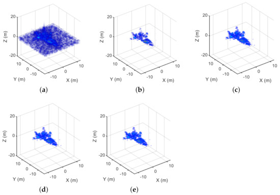 Firstly, an aircraft model is used for simulation, whose length, width and height are 16, 12 and 8 m, respectively. The main simulation parameters are as follows. the carrier frequency is 37.5 GHz and the bandwidth is 0.164 GHz. The size of the virtual scanning array is 3 m × 3 m. We fixed the SNR to 20 dB to analyze the performance of different methods. Figure 3 shows the 3D reconstruction results of MF, FIST, SCAD, MCP and GSALSA–Cauchy under full sampling conditions. Figure 4 shows the 3D reconstruction results of MF, FIST, SCAD, MCP and GSALSA–Cauchy at 75% sampling rate. The results show that the proposed method can effectively improve the quality of 3D SAR image. In addition, as expected, as the sampling rate decreases, the image quality decreases.