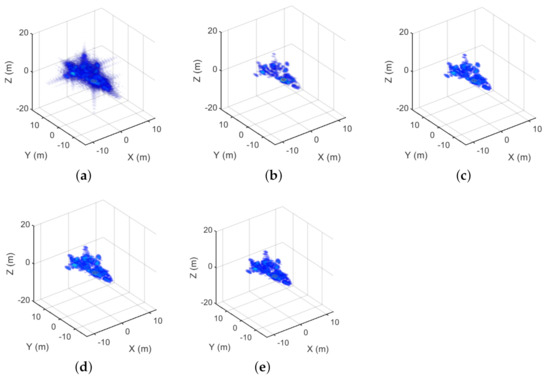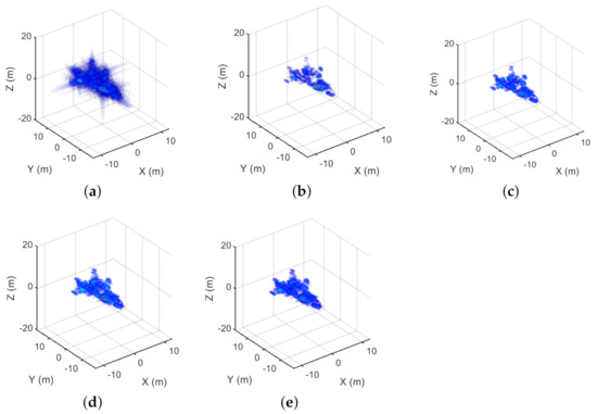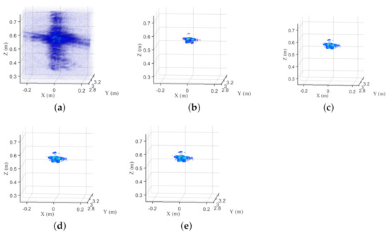 The imaging results of the corner reflector corresponding to the 75% sampling rate. (a) The MF result. (b) The FIST result. (c) The SCAD result. (d) The MCP result. (e) The GSALSA–Cauchy result.