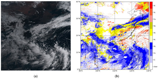 The Himawari-8 satellite is a new generation of geosynchronous satellites developed by the Japan Aerospace Exploration Agency (JAXA), carrying the 16-band Advanced Himawari Imager (AHI) with a spatial resolution of 0.5–2 km [26]. There are differences in the central wavelength distribution compared with the AGRI, which lacks 0.51 μm, 7.3 μm, 9.6 μm, and 11.2 μm wavelengths, but the AHI does not have 1.37 μm wavelengths. JAXA has developed a variety of cloud product data for it. In this paper, the cloud-type product of the Himawari-8 satellite is used as the label for the model training process, and it is also used to test the results of the model [27,28]. The JAXA product is available online: https://www.eorc.jaxa.jp/ptree/index.html (accessed on 15 September 2020). We will use Ci (Cirrus), CS (Cirro-Stratus), Dc (Deep-convection), AC (Alto-Cumulus), AS (Alto-Stratus), NS (Nimbo-Stratus), Cu (Cumulus), SC (Strato-Cumulus), and St (Stratus) to indicate the different cloud types in the following. The Himawari-8 satellite observation image and cloud type product are shown in Figure 2.