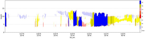 CloudSat and CALIPSO are equipped with cloud-profiling radar (CPR) and polarization lidar to actively measure the vertical structures inside the clouds. These data greatly contribute to understanding the macrophysical and optical properties of the clouds [29]. The analysis of cloud vertical structures further improves the accuracy of cloud classification tasks [30,31]. Their products have been developed over the years, they are widely recognized for their quality, and they are commonly used in the results inspection process [32]. The cloud type variable visualization for the CloudSat satellite 2B-CLDCLASS is shown in Figure 3.
