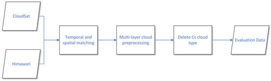 Because the CloudSat 2B-CLDCLASS data are the vertical structure of clouds, there will be a situation where multilayer clouds are observed. FY-4A and Himawari-8 satellites are geostationary satellites, they are very difficult to obtain the vertical structure of clouds with, and the obtained data mainly contain information about cloud tops, so we pay more attention to the cloud types in the top layers. In order to use this data for our evaluation process, we needed to preprocess the 2D cloud classification results contained in CloudSat 2B-CLDCLASS to give a single layer of cloud classification results. When there are Dc and NS cloud types in the multilayer clouds, we marked the cloud type at that location as Dc or NS. For other cases of multilayer clouds, we used the higher layer clouds as the cloud type for the current location. CloudSat is missing the CS cloud type compared with the Himawari-8 cloud classification products, and we needed to remove this cloud type from the evaluation process. When the result contained CS cloud type, the point data and CloudSat data are deleted at the same time. The preprocessed cloud-type data are used in the evaluation process. The CloudSat data preprocessing process is shown in Figure 4.