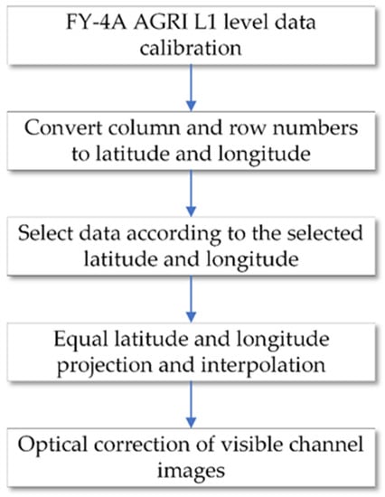 Finally, the visible channel data are optically corrected. The reflectance observed by the visible channel of the satellite is affected by solar radiation. It needs to be optically corrected using the cosine of the solar zenith angle to ensure that the radiation level in the direct sunlight region is consistent with the dark side. The data preprocessing flow is shown in Figure 6.