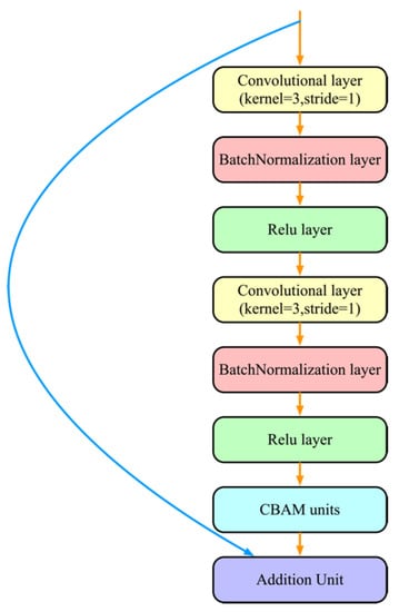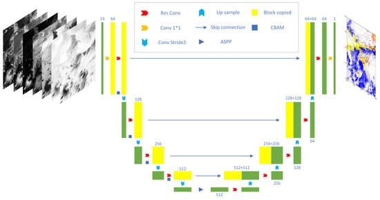 As shown in Figure 7, the model structure is divided into encoder and decoder sections with four downsamples and four upsamples, respectively, corresponding to the left and right sides in Figure 7. In the encoder section, the input data are preprocessed FY-4A observation images containing 14 × 800 × 800 pixels. The data are adjusted for the number of data channels by means of a 1 × 1 convolutional layer, which avoids causing information loss at the input layer. The encoder section contains a Res-Conv unit in each layer, which incorporates the residual module and the CBAM module, allowing the network to avoid information loss while increasing the depth of the network. However, the network gains channel and spatial attention. The data from the residual modules and CBAM modules are summed with the original data to complete the feature extraction task. The structure of the Res-Conv unit is shown in Figure 8. During downsampling, the CLP-CNN uses a convolutional layer with a stride of 2 to achieve downsampling, which avoids information loss caused by the pooling layer. The ASPP module was used to extract features at different levels of integration after the last downsampling.