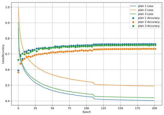 Cross entropy was chosen as the loss function of the model, and Adam was chosen as the optimizer of the model in training [41]. The constructed training dataset is input into the model in dimensions of batch × 14 × 800 × 800 for training. As the number of iterations increases, the variation in the loss and accuracy of the 3-channel combination plan with an increasing number of iterations is shown in Figure 9. A variable learning rate is used in training, and at 110 epochs, the loss and accuracy change significantly as the learning rate changes. Loss is used to describe the bias of the network during the training process. Equation (1) represents the bias for each class in the network. Equation (2) represents the definition of Loss. As shown in Equation (3), accuracy represents the change in accuracy of the testing dataset during the training process.