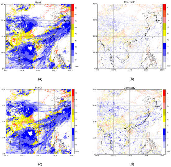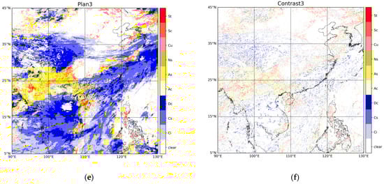 In this paper, AGRI-observed images of FY-4A from 2019 were chosen to be used as a test set for the model and were used to evaluate the three different channel combination plans presented in Section 3.2. The output of the three plans and the differences in comparing the Himawari-8 CLTYPE products are shown in Figure 10. The outputs of plans 1, 2, and 3 are shown in Figure 10a,c,e, respectively. Figure 10b,d,f separately show the points in the output where the types differ when compared to Himawari-8. These different points are identified in the figures using the classification results of Himawari-8. The blank area is the area where the classification results of both are consistent.