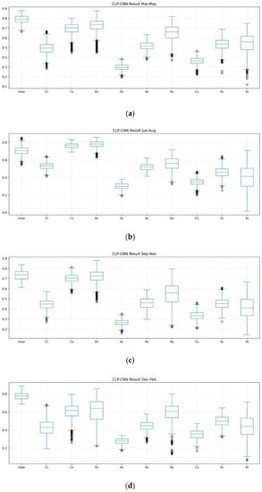 Results of the classification evaluation for the different seasons. (a) CLP-CNN Result Mar-May; (b) CLP-CNN Result Jun-Aug; (c) CLP-CNN Result Sep-Nov; (d) CLP-CNN Result Dec-Feb.