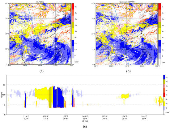 By comparing the output results of the CLP-CNN and Himawari-8 products shown in Figure 13 with CloudSat, it can be found that the output results of the CLP-CNN network were worse than those of the Himawari-8 products only in a few situations of AC, Ns, and Cu type clouds and clear. In the regions with different classifications, the cloud classification results of CLP-CNN are closer to those of CloudSat. The reason for this problem is also the difference between the satellites and the feature extraction abilities of the CLP-CNN network for long-term sequence data. Therefore, the CLP-CNN network has a good classification effect on the observation data of geosynchronous satellites.