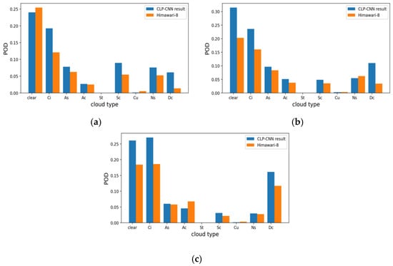 To more clearly evaluate the accuracy of the CLP-CNN output cloud-classification results, we selected different points from the CLP-CNN output results and the Himawari-6 products. We conducted a seasonal test using CloudSat 2B-CLDCLASS data from January to July 2019. The selected points with different classifications were matched with CPR scanning points closest to the point and compared with CloudSat. The comparison results were evaluated by POD. The statistical results of the evaluations are shown in Figure 13.