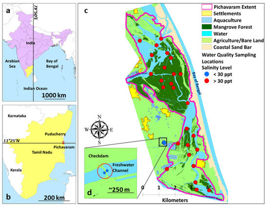 Location of the Pichavaram mangroves in Tamil Nadu, Southeast India (a,b). The mangrove area, along with the adjacent land-use and land-cover such as agriculture, aquaculture, check-dams on freshwater streams, and settlements, is illustrated (c). Locations of water quality samples are also shown along with the observed salinity levels (d).