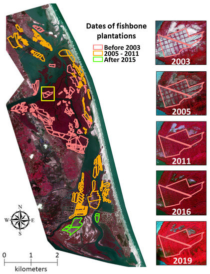 We wanted to analyze the success and/or failure rates in the fishbone plots implemented just prior to the Quickbird image acquisition of 2003 (Figure 3). For this, we visually delineated fishbone units on all VHSR images; plots were segregated based on the time of their implementation (i.e., plots laid prior to 2003, between 2005 and 2011, between 2011 and 2016, and between 2016 and 2019). Some fishbone plantation units were implemented close/adjacent to one another: if it was during the same timeframe, we gathered them into a singular unit assuming that the geographical and environmental conditions were likely to be identical.