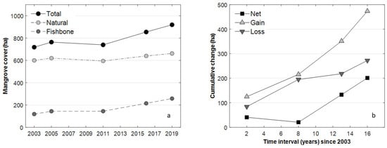The gain and loss in mangrove habitat have been gradual, with mangrove gross gains of 17.4% (124.8 ha), 30.0% (215.6 ha), 49.3% (354.1 ha), and 65.9% (473.6 ha) and mangrove gross losses of 11.7% (84.0 ha), 27.1% (195.0 ha), 30.4% (218.4 ha), and 37.9% (272.4 ha) at 2, 8, 13, and 16 year intervals, respectively (Figure 5b). The mangrove gross loss was always lower than the mangrove gross gain, and a net gain of mangrove areas of 28.0% (201.2 ha) relative to the mangrove cover of 2003 was assessed.