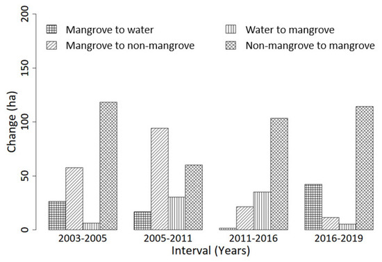 Non-mangrove areas overall contributed to 396.4 ha of the mangrove growth between 2003 and 2019 with progressive increments of 118.5 ha (2003–2005), 60.3 ha (2005–2007), 103.4 ha (2011–2016), and 114.2 ha (2016–2019). Conversion from water to mangrove areas was also observed, albeit negligible, with an overall conversion between 2003 and 2019 of 2%. Conversely, we observed an overall combined loss of mangrove areas to non–mangrove or water areas with progressive losses of 84.1 ha (2003–2005), 81.9 ha (2003–2011), 61.8 ha (2003–2016), and 59.1 ha (2003–2019), this latter value corresponding to 8.2% of the mangrove area in 2003.