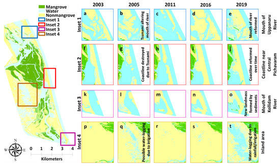 Changes, with a focus on the land (mangrove or non-mangrove) to water changes, in the land-cover of Pichavaram area and surrounding areas such as (a–e) the mouth of the Uppanaru River, (f–j) coastline near the central Pichavaram forest, (k–o) the mouth of the Kollidam River, and (p–t) inland area.