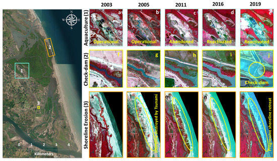 Changes observed in the land-cover of Pichavaram mangroves and the surrounding areas from the visual inspection of the VHRS images (image excerpts on the right) in combination with a 2016 color-composite image provided by Google Earth (left). Aquaculture expansion in the vicinity of the mangrove forest (a–e), check-dam construction in freshwater channel to Pichavaram (f–j), and progressive shoreline erosion (k–o) can be easily identified and monitored.
