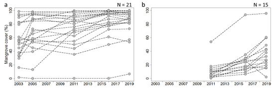 Changes in the mangrove cover (% relative to fishbone area) within individual fishbone plots implemented prior to or in (a) 2003 and (b) between 2005 and 2011.
