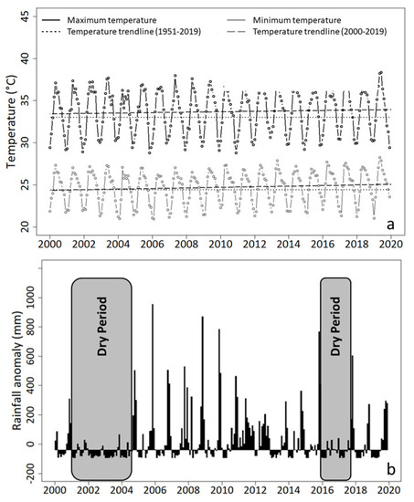 Air temperature for Cuddalore, near Pichavaram. Monthly maximum and minimum temperatures are provided for the time period of 2000−2019. Linear trends for both the 1951−2019 and 2000−2019 time periods are also indicated (a). Median rainfall anomalies for Pichavaram from 2000 to 2019 (encompassing the study period) are presented. Abnormal dry periods from 2001 to 2005 and from 2016 to 2017 are highlighted (b).
