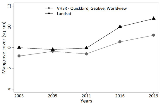 The VHSR-based mangrove cover estimates (from 718 ha in 2003 to 919 ha in 2019) were consistently lower than the Landsat-derived mangrove cover estimates (from 800 ha to 1078 ha) for the same study area (Figure 12).