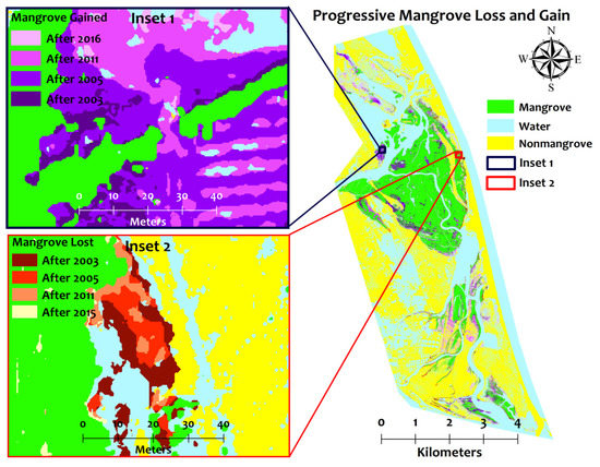 Further, this analysis highlights the robustness of the VHSR images in capturing details of the changes that have occurred in the mangrove ecosystem including progressive gain and loss of mangrove habitat since 2003. The ecosystem itself is very dynamic, with constant changes taking place at a very fine spatial scale. As evident from Figure 13, changes that were captured by the VHSR images in this study would otherwise be difficult to observe and analyze using moderate or coarse resolution images.