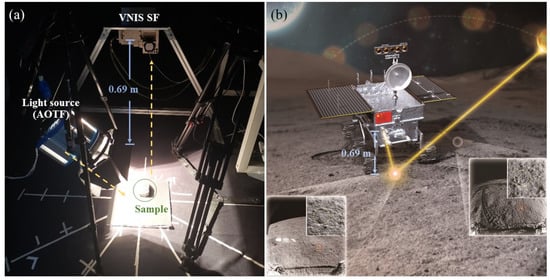(a) The picture of the VNIS SF experiment condition. (b) The model picture of the detecting condition of VNIS on the lunar surface [].