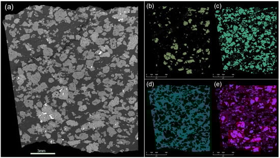 Petrographic observations of the comparison samples were performed by backscattered electron (BSE) imaging using a Thermo Fisher Apreo field emission scanning electron microscope with a Bruker XFlash 60 energy dispersive spectroscopy (EDS) detector at the Institute of Geology and Geophysics, Chinese Academy of Sciences (CAS), Beijing, China. The instrument was operated at accelerating voltages of 10–15 kV with 1.6–13 nA beam currents. The mineral distribution map was constructed using Maps and Nanomin software []. The calculation method of mineral composition involves collecting BSE and X-ray signals at each point and comparing them with recipes of the database to recognize the minerals automatically.