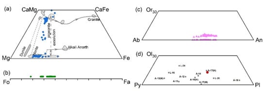 (a) Composition of pyroxene in the Ca-Mg-Fe quadrilateral []. (b) Range of compositional variation in olivine. (c) Composition of feldspars in the Or (30%)-Ab-An triangle. (d) Composition of CR-1 in the olivine (30%)-pyroxene-plagioclase triangle []. The results of this study are marked as color points.