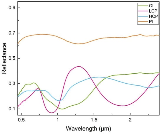 The spectra of end-members of CR-1 detected by TerraSpec-4. The green, pink, blue, and orange lines show the spectra of olivine, LCP, HCP, and plagioclase, respectively.