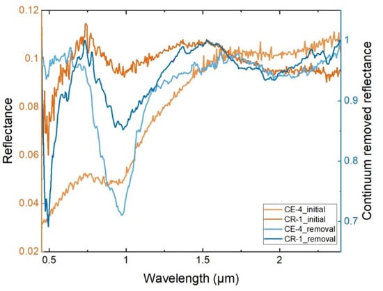 The spectra of CR-1 detected by the VNIS SF exhibited evident absorption features at wavelengths of 971 (±1) nm and 1957 (±8) nm (Figure 6), which were longer at 1000 nm and shorter at 2000 nm than those of the Chang’e-4 rock. The results are similar to those of the Chang’e-4 rock but probably have more calcium and less iron [].