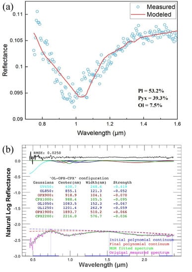 The spectra are illustrated in Figure 6, where the rock was detected on the 3rd lunar day of the mission. Using the data provided by the Lunar and Deep Space Exploration Scientific Data and Sample Release System (China National Space Administration, CNSA) (Table S1) and the method described by Yang et al. [], the absorption peaks around 1 and 2 μm were determined to be 958 (±12) nm and 2043 (±12) nm, respectively. The Hapke model results indicated 11.7% olivine, 42.8% pyroxene, and 45.5% plagioclase, whereas MGM indicated 31% olivine, 30% orthopyroxene, and 40% clinopyroxene.