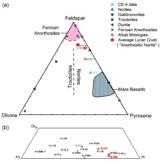 (a) Modal proportions of major minerals in the highland pristine igneous rocks and monomictic breccias []. (b) Composition of the Chang’e-4 rocks in the olivine (30%)-pyroxene-plagioclase triangle compared with data of Apollo and Luna. Sampling sites are indicated; for example, A-11 is Apollo 11 and L-16 is Luna 16. (H) and (M) indicate highland soil and mare soil, respectively.