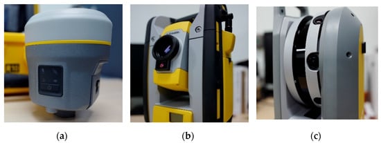 Equipment: (a) R10 (GNSS); (b) RTS-773 (total station); and (c) X7 (laser scanner).
