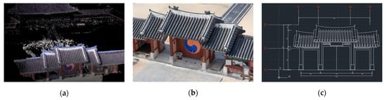 Reverse engineering data by steps: (a) Initial point cloud data (PCD); (b) 3D modeling data (BIM); and (c) Drawing from BIM data.