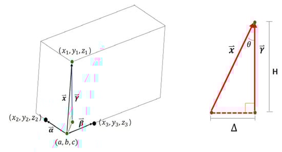 The 3D point cloud model can measure deflection and deformation, such as tilting and vertical displacements. Point clouds were generated from the GPS data and represented in a 3D coordinate space with the transformed GPS data. With the locations developed, it was possible to measure the deflection of the slab and column deformation. The edges were calculated as vectors, and slopes were measured as the angles between the sides and floor. Vertical and horizontal displacements of the edge of the building were estimated through comparisons with 3D coordinate location data of each floor points. The 3D model, generated using the laser scanner, uses GPS to calculate the position coordinate of each point of the point cloud, which can be used for measuring the selection and deformation. It is possible to calculate the height and lateral displacement and check the value of the election and deformation given in Equation (1) (Figure 6) [,,].