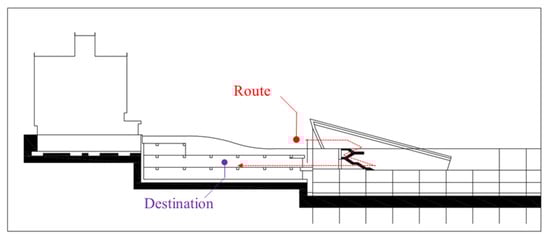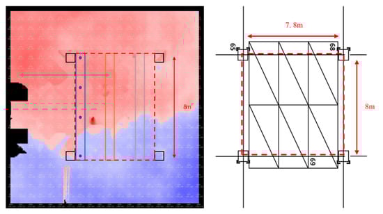 The deflection degree of the slab that received the most load continuously was measured, and the structural estimation for deflection was performed accordingly. The section of the slab floor is obtained from the PCD through the post-processing step; the ‘Floor Inspection’ function of the ‘Real Works’ program was used. Based on the average value of the height, a position higher than the standard was marked in red. The lower part is marked in blue to indicate the relative deflection value, confirming that the height of the position is relatively low (Figure 17).