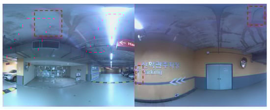 Visual inspection can be performed through image data acquired by the scanner. The image data are high-definition panorama images that can locate cracks and deteriorated structures through images in the office. For the visual evaluation, several types of detection were checked: crack, exfoliation (breakout), water leakage, efflorescence, etc. The presence of cracks was determined based on the images captured through the laser scanner, but it cannot check the volumetric features of the crack, such as crack depth. The multidisciplinary photogrammetry techniques with several innovative techniques should be used to inspect in detail. For example, in the case of the evaluation for surface aging, it can be performed through state evaluation by measuring the area of the defect.