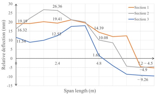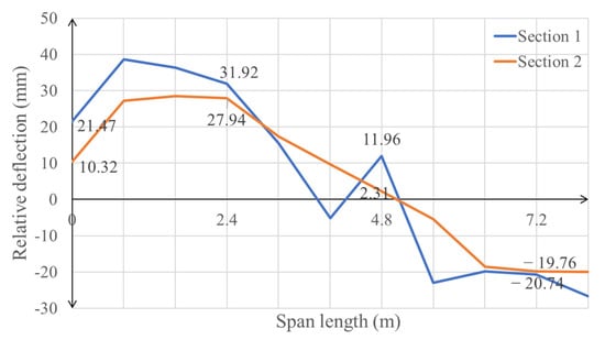 The deflection value was obtained by evaluating two sections according to the span length (L). The span length was 8 m, the distance between the columns was defined as the difference between the maximum and minimum relative deflections of the two sections (Figure 18).