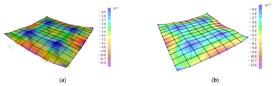 In this study, the deflection degree of the slab that received the most load continuously and structural estimation for the deflection and deformation were performed accordingly. The section of the slab floor was obtained from the PCD through the post-processing step; the ‘Floor Inspection’ function of the program was used. Based on the average value of the height, a position higher than the standard was marked in red. The lower part is marked in blue to indicate the relative deflection value, which confirms that the height of the position is relatively low (Figure 11).