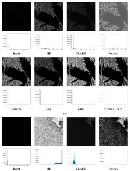 It can be seen from the visual results that all methods can realize visualization to a certain extent. However, the traditional methods have defects on different fronts. The HE improves contrast significantly, while its result shows excessive enhancement. In other words, it leads to the loss of details and the distortion of structure, along with the amplification of noise. CLAHE prevents excessive enhancement by presetting a threshold value. But it has a poor performance in improving contrast. Retinex shows an acceptable tradeoff between proper contrast and detailed feature preservation. However, its results look distributed by noise in some scenes. In short, these adaptive algorithms have the above problems, and it is difficult to ensure the consistency of the visual effect. The Gamma correction and logarithmic transformation are not adaptive and depend on the selection of parameters. They even perform worse than the other methods. From the perspective of contrast enhancement, noise suppression, detail retention and adaptivity, the proposed algorithm is superior to the traditional algorithms. As shown in Figure 7, our method obtains better results compared to the traditional ones. This can be explained from two aspects: (1) Our method can notably improve contrast with better preserving details and suppressing noise; and (2) The method has high adaptivity and its results can maintain a consistency. Moreover, an important criterion for SAR image dynamic range compression is to preserve the intensity ranks in the output image. By observing the histogram of the input image, our method protects the ranks of the intensity levels in original SAR images compared with other methods. Besides, the histogram distribution of results achieved by our method is consistent with the ground truth. This also confirms the superiority of our method.