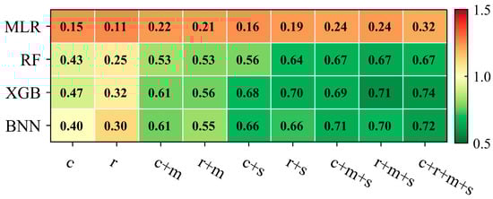 The model training statistics with various combinations of predictors and models are summarized in Figure 2. The machine learning models always outperformed the MLR. The XGB model showed better prediction skills than RF, and was comparable with the BNN. XGB showed a stronger ability than RF to integrate multisource data; the R2 of XGB increased as more predictors were adopted, while the R2 of RF reached the maximum (0.67) after integrating three types of predictors. The BNN outperformed XGB when it was driven by the combination of climate, management, and soil predictors, but XGB generally showed slight outperformance over the BNN when driven by other combinations.