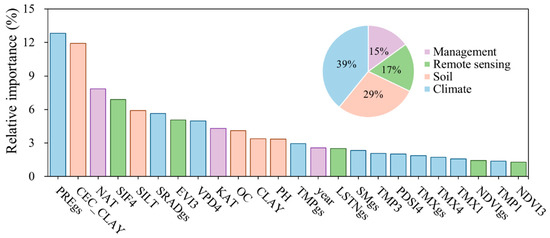 The relative importance in maize yield prediction of climate, soil, remote-sensing, and management predictors was 39%, 29%, 17%, and 15%, respectively (Figure 3). There was a total of 23 predictors with relative importance greater than 1%. Among them, there were 10 climate predictors. Growing-season total precipitation (PREgs; 13%), the growing-season mean downward shortwave flux at the surface (SRADgs; 5.6%), and the fourth-month mean vapor pressure deficit (VPD4; 5%) were the top three climate predictors. Five soil predictors entered the final model, and the top three were the cation-exchange capacity of clay (CEC_CLAY), silt fraction (SILT), and percentage of organic carbon (OC), whose relative importance accounted for 12%, 5.9%, and 4.1%, respectively. There were four remote sensing predictors. Among them, the fourth-month maximum solar-induced chlorophyll fluorescence (SIF4) and third-month maximum enhanced vegetation index (EVI3) were the top two predictors. They made a relatively equal contribution to maize yield prediction, at 6.9% and 5.1%, respectively. There were three management predictors, among which the nitrogen application total (NAT) made the greatest relative contribution, at 7.9%.