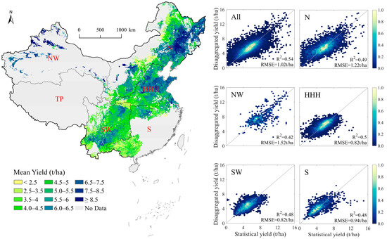 When cross-validated with the county-level statistical yield (Figure 4), our disaggregated yield can explain around 54% of the county-level yield variation in mainland China, with an RMSE of 1.02 t/ha. The gridded yield performed best in the Northern China maize zone and the Huang-Huai-Hai maize zone—two maize-planting zones. For regions with sparsely sown areas, it was more challenging to derive reasonable cross-validation scores, i.e., the northwestern maize zone.