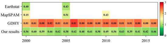Our method largely improved upon the accuracy of the gridded yield from the existing gridded maize yield datasets (Figure 5). Compared with EarthStat, the RMSE of our results was reduced by 16%, and the R2 increased by around 0.13. Compared with MapSPAM, the RMSE of our results was reduced by 29–41%, and the R2 increased by about 0.17, showing much better consistency with the statistical yields. Notably, there is a cutoff at 10 t/ha in MapSPAM2000, inconsistent with the statistical yields. Compared with GDHY, the improvement of our results was even greater than that of the previous two datasets. GDHY offered continuous annual yield series, but its R2 was rather small (<0.02), and the RMSE was mostly greater than 2 t/ha.
