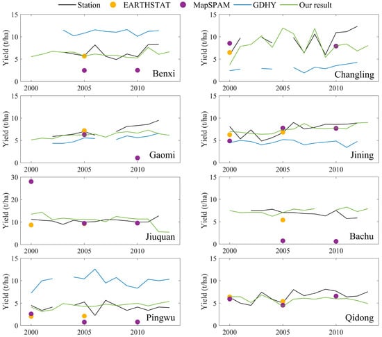 In general, the yield series of our disaggregated results could capture the mean and interannual variation of the station records. Among the 99 sites (Table S2), the average R2 of our results was 0.30, and the average RMSE was 2.39 t/ha, outperforming the other datasets. The only dataset with continuous yield was GDHY, and its average R2 was 0.28, while its average RMSE was 3.17 t/ha. The RMSE of our results was 0.3 t/ha lower than that of EarthStat and 0.81 t/ha lower than that of MapSPAM for specific years. The yield series of the 24 best-documented sites are shown in Figure 6 and Figure S7. At most sites located in the major croplands, the yield series of our results (green lines) were much closer to the observations (black lines) than other yield datasets. However, in the minor corn-growing area, the capability of our method to capture the average and variability of maize yields was similar to that of other datasets, e.g., Qidong station in Jiangsu Province. In addition, there is a discontinuity in our results (green line) for Bachu station in 2009, because there were missing values in the remote sensing images.
