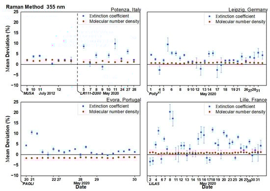 In Figure 2, the mean relative deviation of extinction and molecular number density at 532 nm for all four stations are shown. The results are very similar to those found for the extinction at 355 nm. The maximum value of the deviation of extinction at 532 nm is around 20%, and the mean deviation for all cases is around 5%. For all cases, the mean relative deviation of molecular number density is always within .