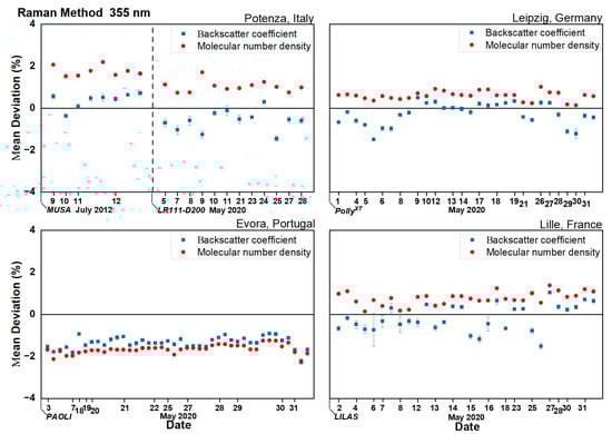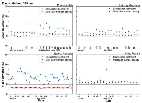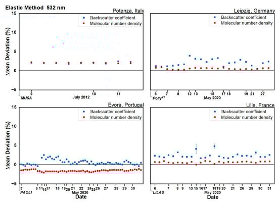 For the elastic backscatter coefficient at 532 nm, the mean relative deviation is within (see Figure 6). The maximum deviation of backscatter is 4.8%, corresponding to an observation made by the Lille station for which the deviation in the molecular number density is 0.2%.